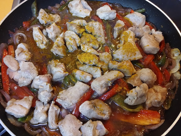 Cuando empiece a hervir, incorporamos la carne y el curry.