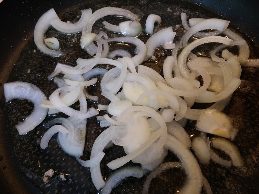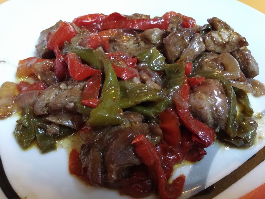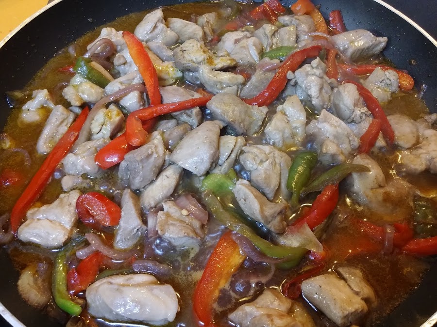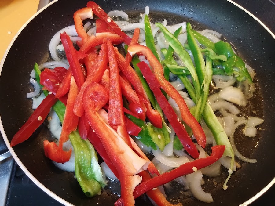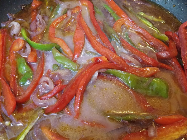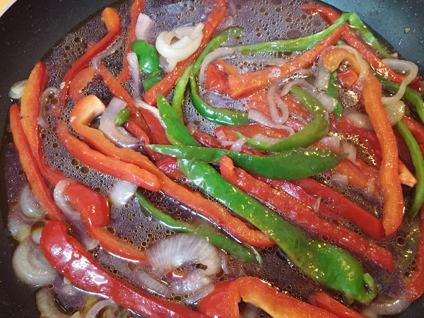 Mientras vamos cortando la cebolla y los pimientos en juliana.