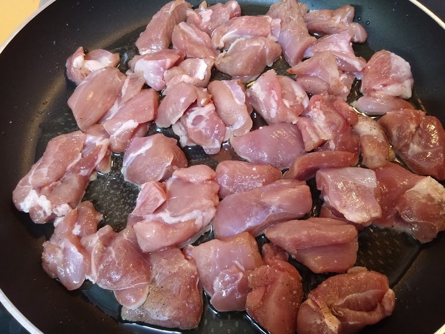 Salpimentamos la carne. Si los trozos son muy grandes los cortamos algo más pequeños. Calentamos aceite en una sartén amplia y doramos la carne.