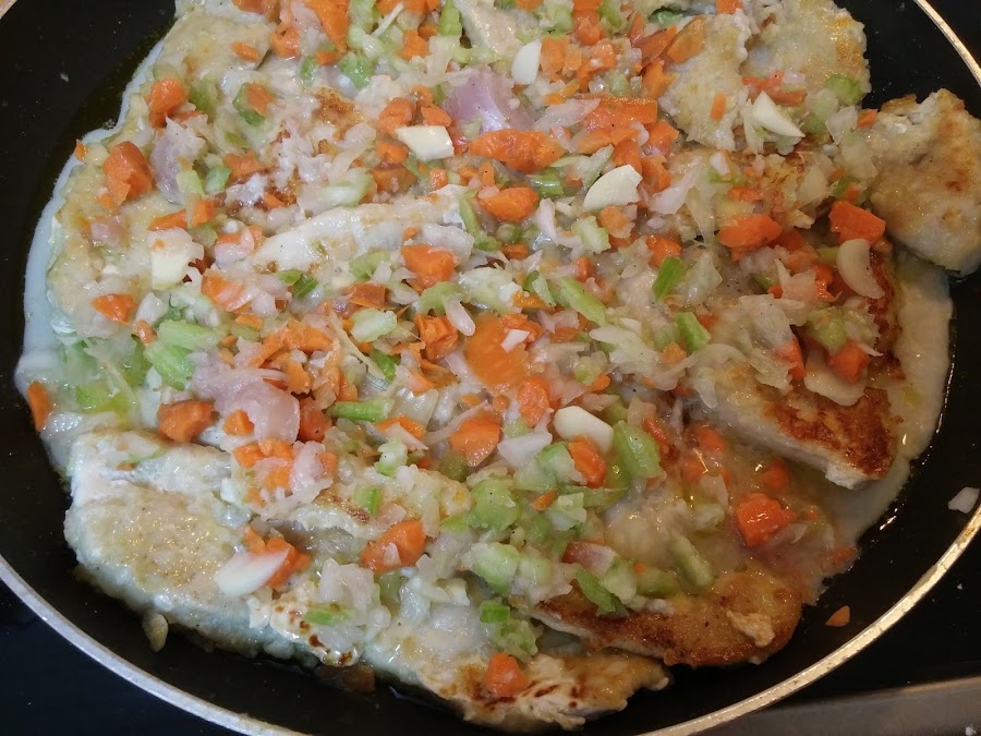 Añadimos todas las verduras bien picaditas: la cebolla, la zanahoria, el apio y los ajos. También un vaso de vino blanco y una pizca de sal y pimienta.