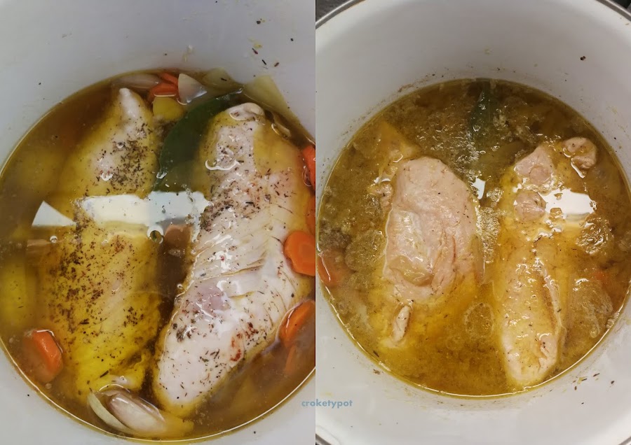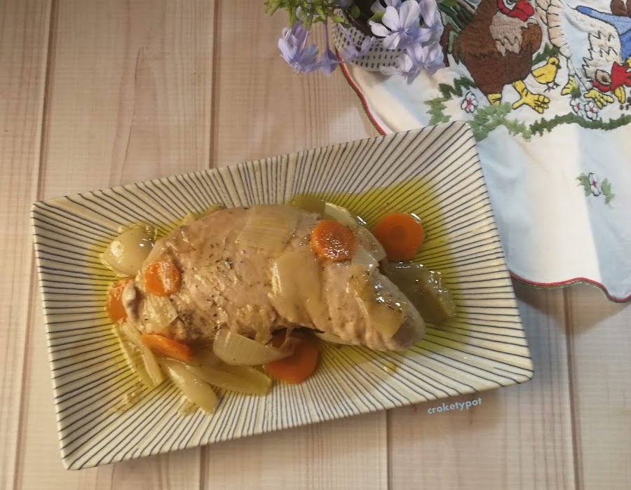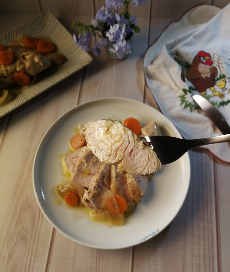 INGREDIENTES: 2 solomillos de pechuga pavo, 1 chalota, media cebolla fresca, 1 zanahoria, 4 ajos, 1 hoja de laurel, mezcla de 5 pimientas molidas (si no tienes, pimienta en grano), tomillo, sal, 1 vaso de vinagre, 1 vaso de vino montilla y 1 vaso de aceite de oliva Aove.