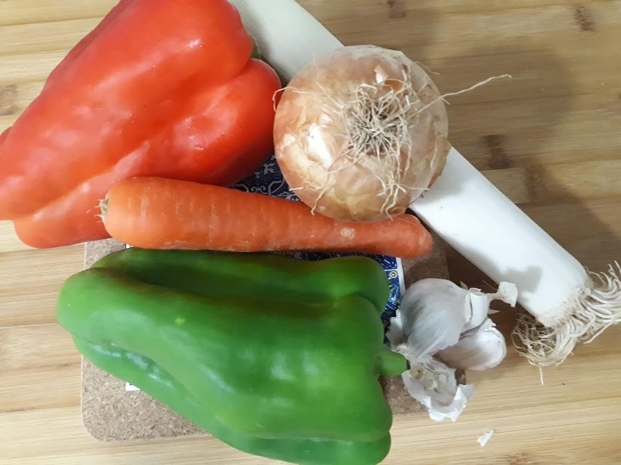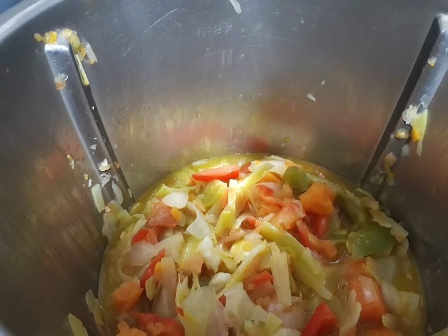 1.- Pelamos y lavamos las verduras. Después las troceamos y las vamos poniendo en el vaso de la thermomix, para triturarlas 5 segundos, velocidad 4.