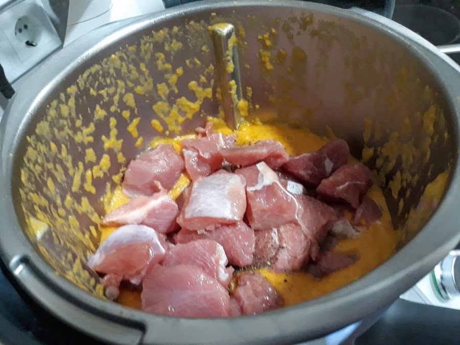 4.- Ponemos la mariposa en las cuchillas y añadimos el pavo a tacos, el vino blanco y salpimentamos a nuestro gusto.