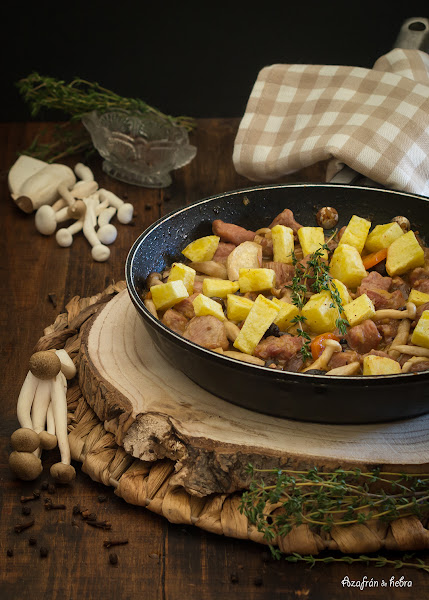Cuando falten 5 minutos, saltear las setas en una sartén caliente con muy poco aceite y colocar sobre el pavo guisado y mezclar. Servir con patatas fritas por encima.