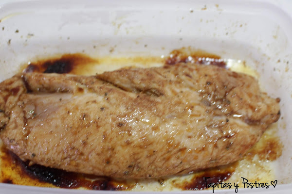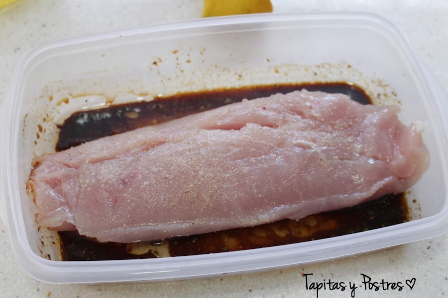 Ponemos la pechuga de pavo previamente salpimentada sobre el marinado cinco minutos por cada cara para que se impregne por todos lados.
