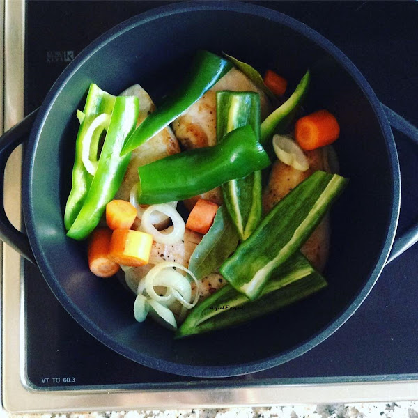 En una cazuela pongo un poco de aceite y doro ligeramente los trozos de pollo/pavo, cuando tienen un poco de color añado el resto de ingredientes.