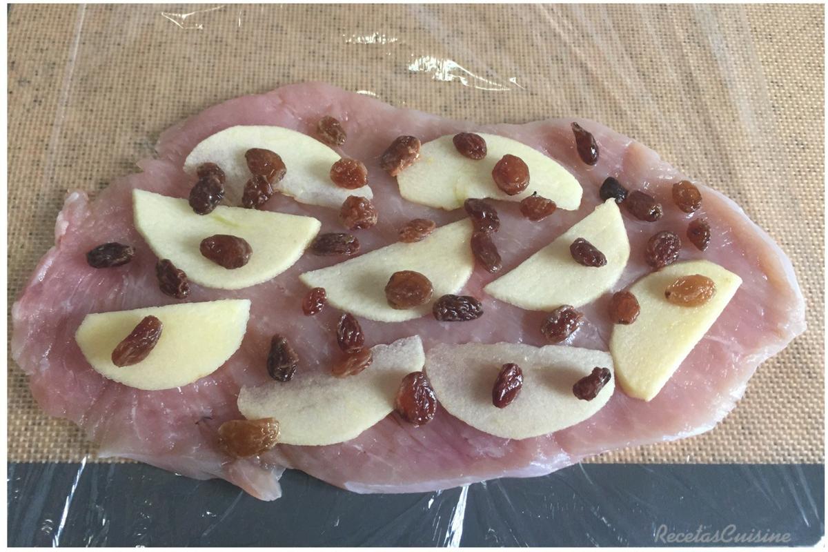 3. Colocamos los filetes de forma individual sobre papel film (el papel entero, sin cortar del rollo). Aplastamos un poco con la mano para que quede más fino. Condimentamos con sal y vamos colocando rodajas de manzana sin llegar a los extremos. Repartimos también las pasas.