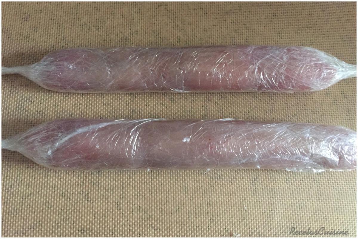 4. Enrollamos el filete, lo haremos intentando dejarlo lo más prieto posible. Una vez lo tengamos. Lo envolvemos en papel film, apretando bien. Cerramos los extremos como si fuese un caramelo y pinchamos con la punta de un cuchillo por varios sitios. Repetiremos el mismo proceso con el otro filete.