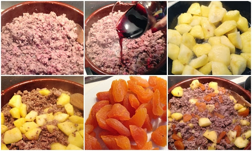 Añadimos una copa de vino rancio y damos unas vueltas. Mientras tanto en la sartén vamos friendo la manzana cortada, y la añadimos a la carne, los orejones los cortamos por la mitad y los añadimos directamente a la carne.