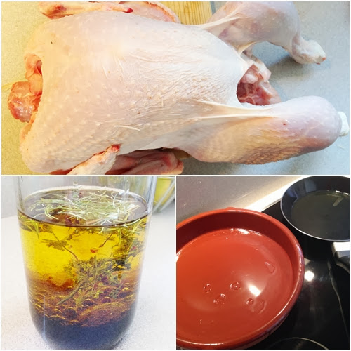 En primer lugar llenamos una botella con aceite de oliva, vino, romero y tomillo, y dejamos que se vaya macerando desde el día anterior, servirá para rociar el pavo mientras este en el horno.