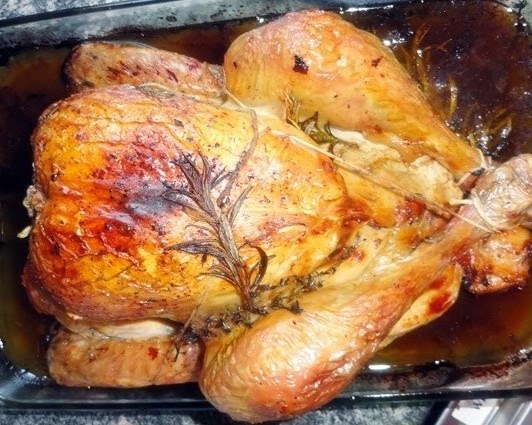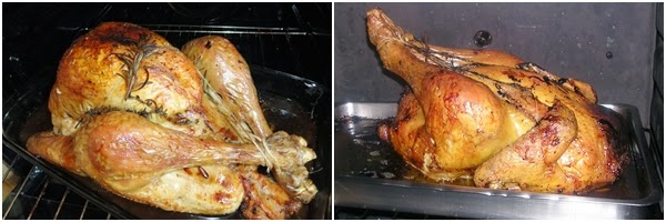 Repartimos la manteca por encima del pavo, bien untado y lo metemos al horno. En cuanto se deshaga la manteca, lo iremos rociando con el preparado macerado de aceite, vino, romero y tomillo, y lo vamos regando con sus propios jugos, para que no se seque. También lo tapamos un poco con papel de horno para que no se dore demasiado.