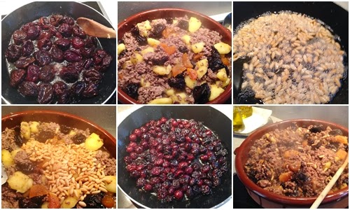 Hacemos lo mismo con las ciruelas sin hueso, las freímos un poco y a la cazuela de la carne, los piñones los doramos un pelin y agregamos a la cazuela, lo mismo con las pasas, cuando estén infladitas, para la cazuela de barro. Controlar la sal y la pimienta.