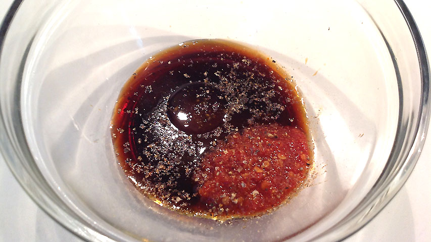 La salsa se prepara mezclando soja con salsa de ostras, vino de arroz -o blanco seco- azúcar moreno, pasta de chiles, aceite de sésamo y pimienta blanca molida.