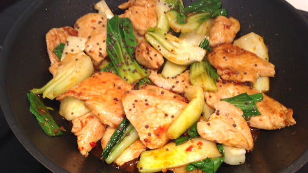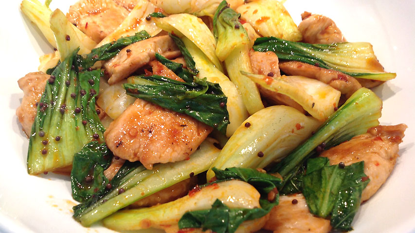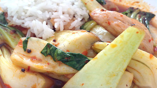Un simple arroz hervido es una guarnición excelente para este pavo salteado con pak choi.