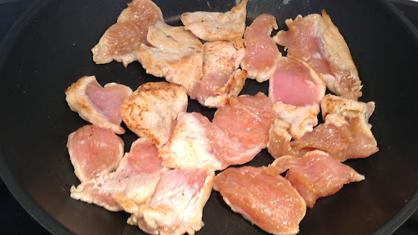 Pon la sartén a fuego máximo, y cuando humee añade una gota de aceite de girasol. Saltea a fuego fuerte el pavo hasta que se dore un poco.