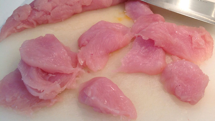 Saca unos filetes delgados y pequeñitos de al parte de pavo -o pollo- que escojas.