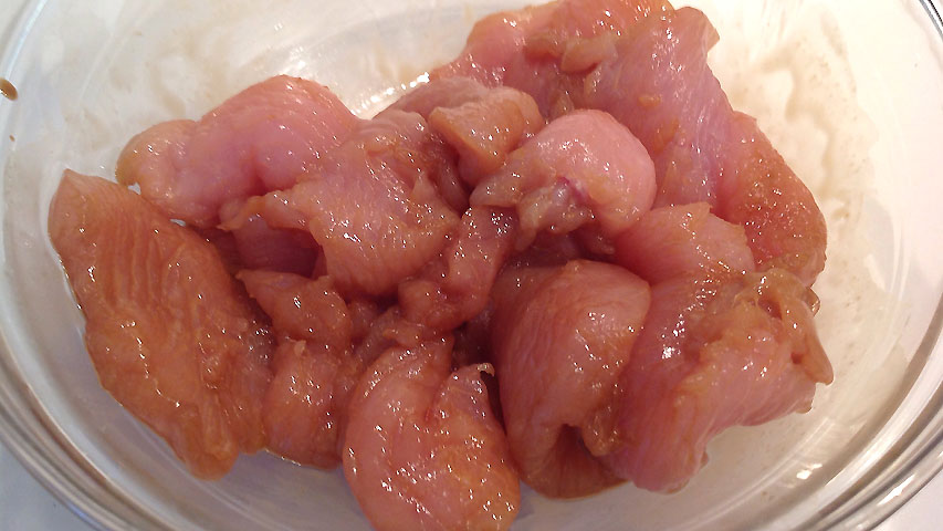 Mezcla la maicena y la salsa de soja y marina el pavo al menos 20 minutos -yo lo dejo toda la noche tapado con un film en la nevera-.