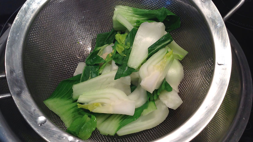 Limpia, trocea y cuece el pak choi 2 minutos en un cazo con agua hirviendo. Escurre bien.