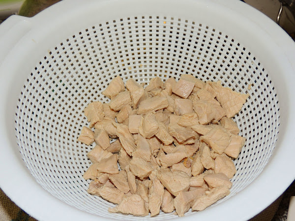 Se cuecen las pechugas en la olla exprés con sal y pimienta, luego se saca, se escurre y se corta en daditos.