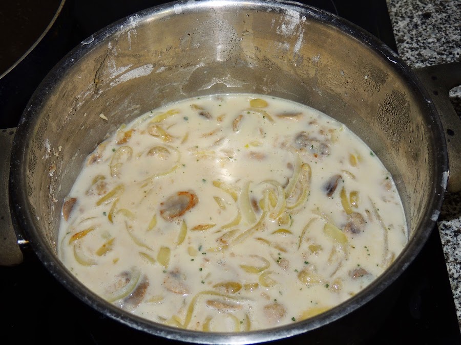 Se cuece sin dejar de remover, se agrega el pavo, se tapa y se deja unos 20 minutos a fuego medio.