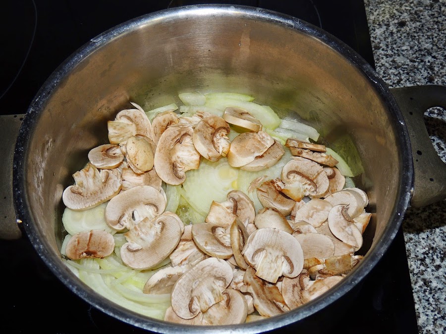 Se funde la mantequilla en una cacerola y se añade la cebolla en juliana y los champiñones a láminas.