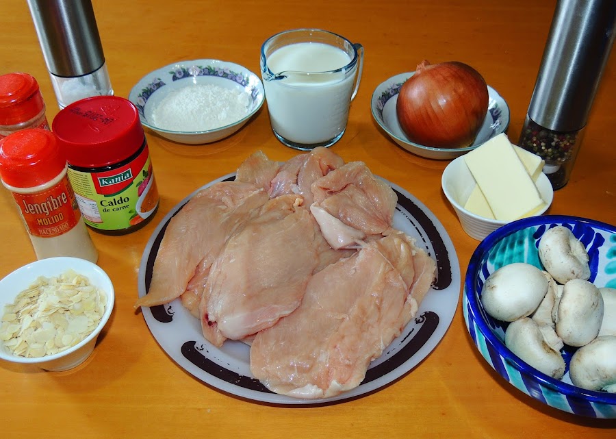 700 gr. de pollo de corral o pavo, 50 gr. de mantequilla, una cebolla, 125 gr. de champiñones, una pizca de jengibre, una pizca de nuez moscada, 150 ml. de caldo de pollo, 250 ml. de leche desnatada, 30 gr. de almendras fileteadas, sal y pimienta.