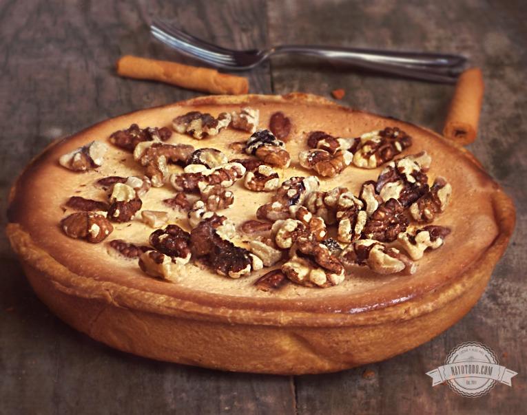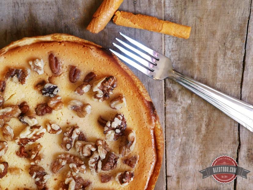 Licúa las leches, el queso, huevos y vainilla. Agrega lo licuado a la base para pay ya refrigerada y mezcla los 50 grs. de nuez picada.