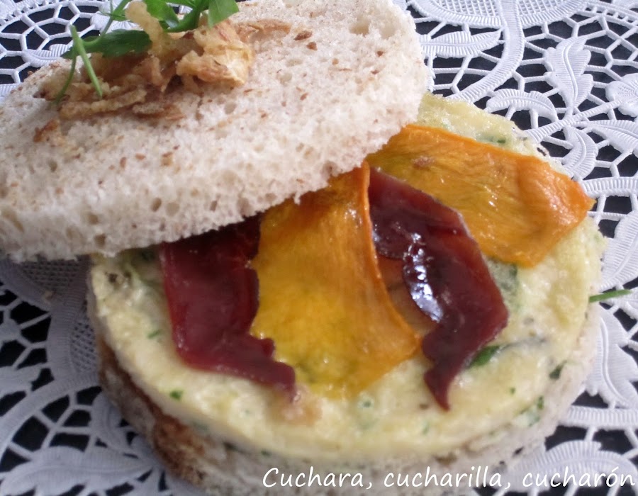 Para acompañar la tortilla, el contraste de la calabaza con miel y el sabroso jamón de pato. Un bocata especial: