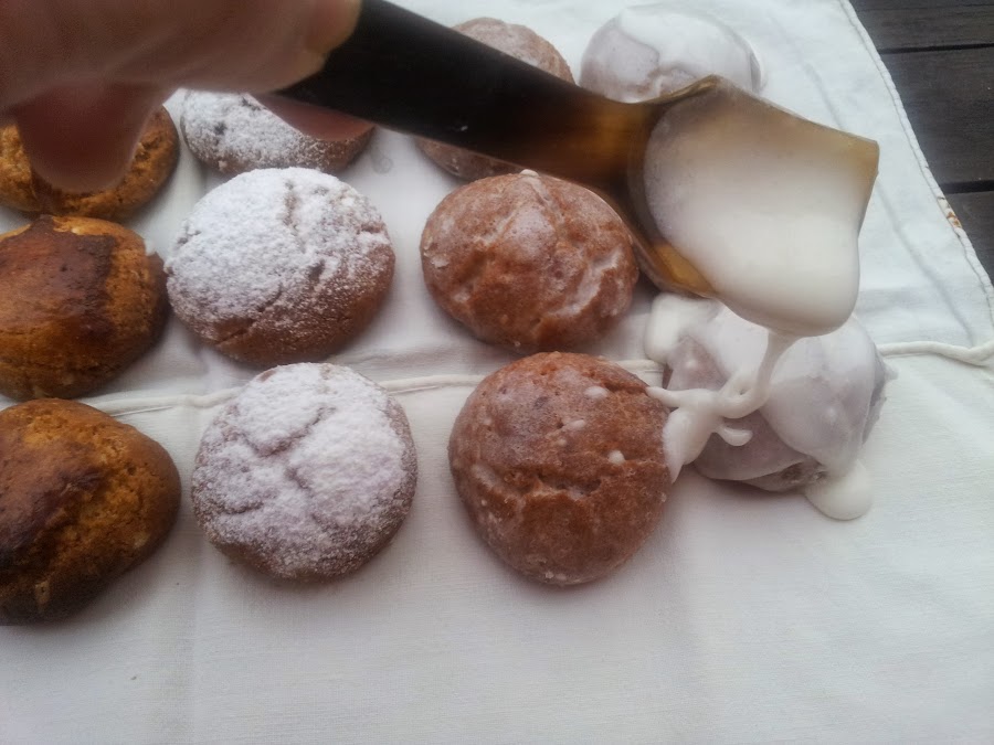 He estado investigando y he visto que lo más habitual para estas galletitas es bañarlas en glasa real. Yo la he hecho, aunque lo normal es añadirle unas gotas de limón, con un clara que llevaba en el frigorífico dos o tres días, es decir que estaba muy acidulada, por lo que no he creído necesario añadirle el limón, además no quería enmascarar el sabor de la galleta.