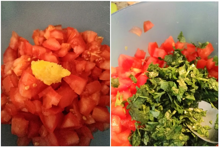 Picar los cebollines y los tomates (sin cáscara) en cuadritos pequeños. Cortar el ají por la mitad y quitarle las pepas, luego cortar también en cuadritos. Sacar las hojas de cilantro y cortar finamente.