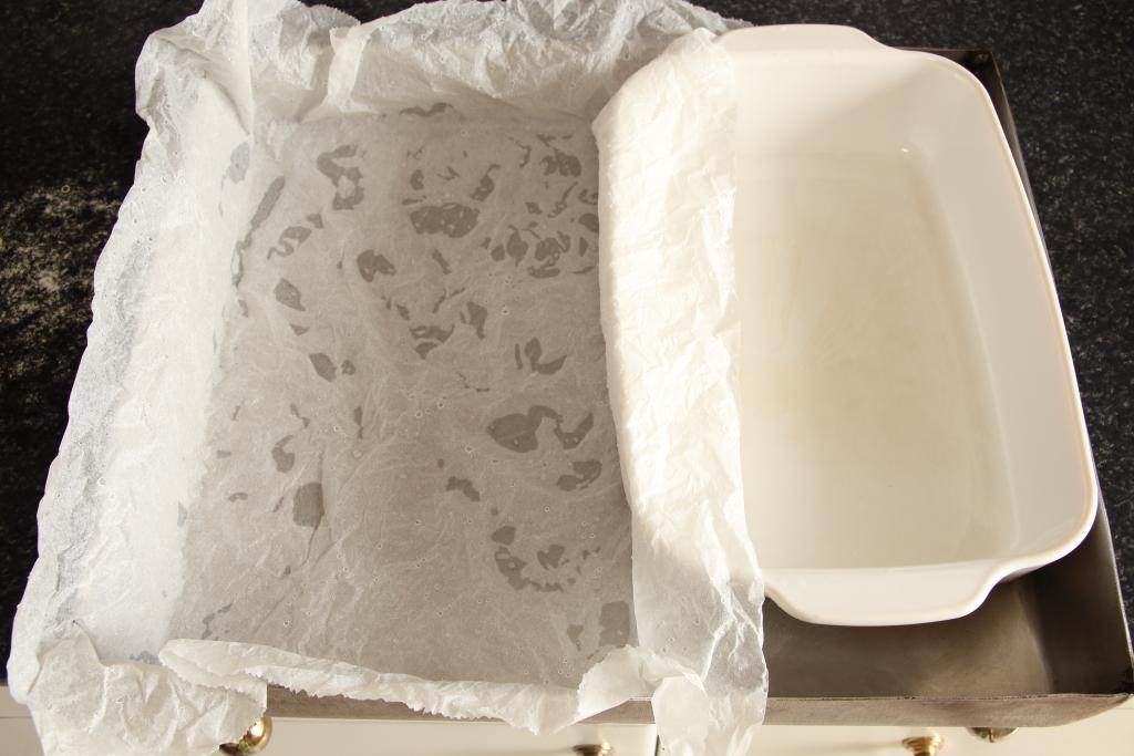 Sacamos la mantequilla de la nevera 1 hora antes de empezar la receta.Escogemos un molde cuadrado o rectangular, (como no tenía ninguno pequeño, he transformado uno grande de la forma que se ve en la foto), forramos con papel de hornear humedecido en agua y bien escurrido. De forma que me queda una medida de pastel de 19 x 30 cm. Reservamos.