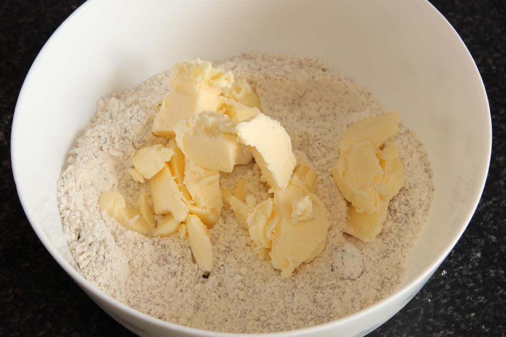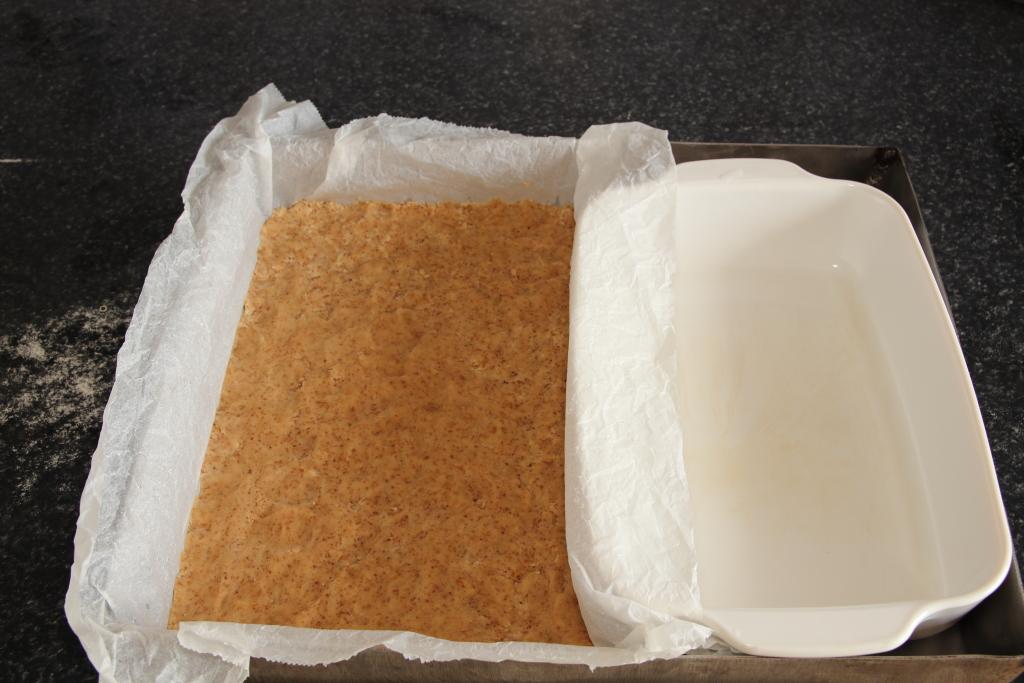 En un bol mezclamos la harina con el azúcar moreno, añadimos la mantequilla blanda y vamos haciendo migas con los dedos. Cubrimos con ellas en fondo del molde, aplastamos bien y sin subir por los laterales, dejando una base uniforme. Hormeamos 15 minutos, a 180ºC, calor arriba y abajo. Retiramos del horno y dejamos atemperar.