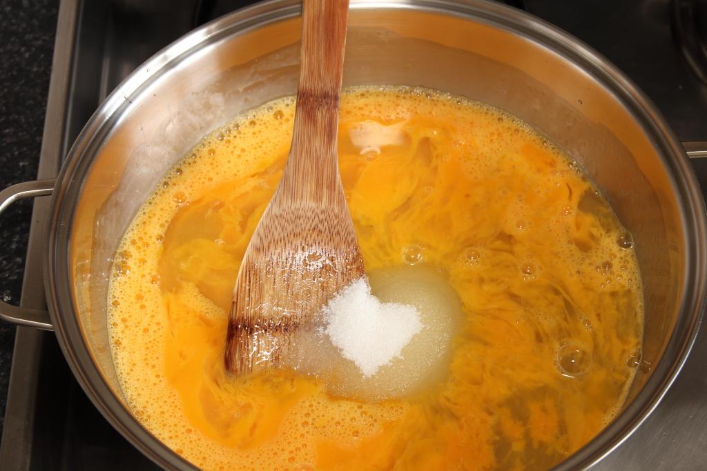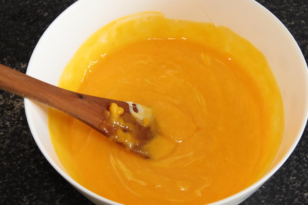 En un cazo o cazuela mezclamos los huevos, el azúcar blando, el zumo de limón y la ralladura, llevamos al fuego, removemos sin parar justo hasta que parezca que empieza a hervir y la crema ha espesado ligeramente. Vertemos sobre el chocolate derretido y removemos con una espátula hasta conseguir una crema lisa y homogénea.