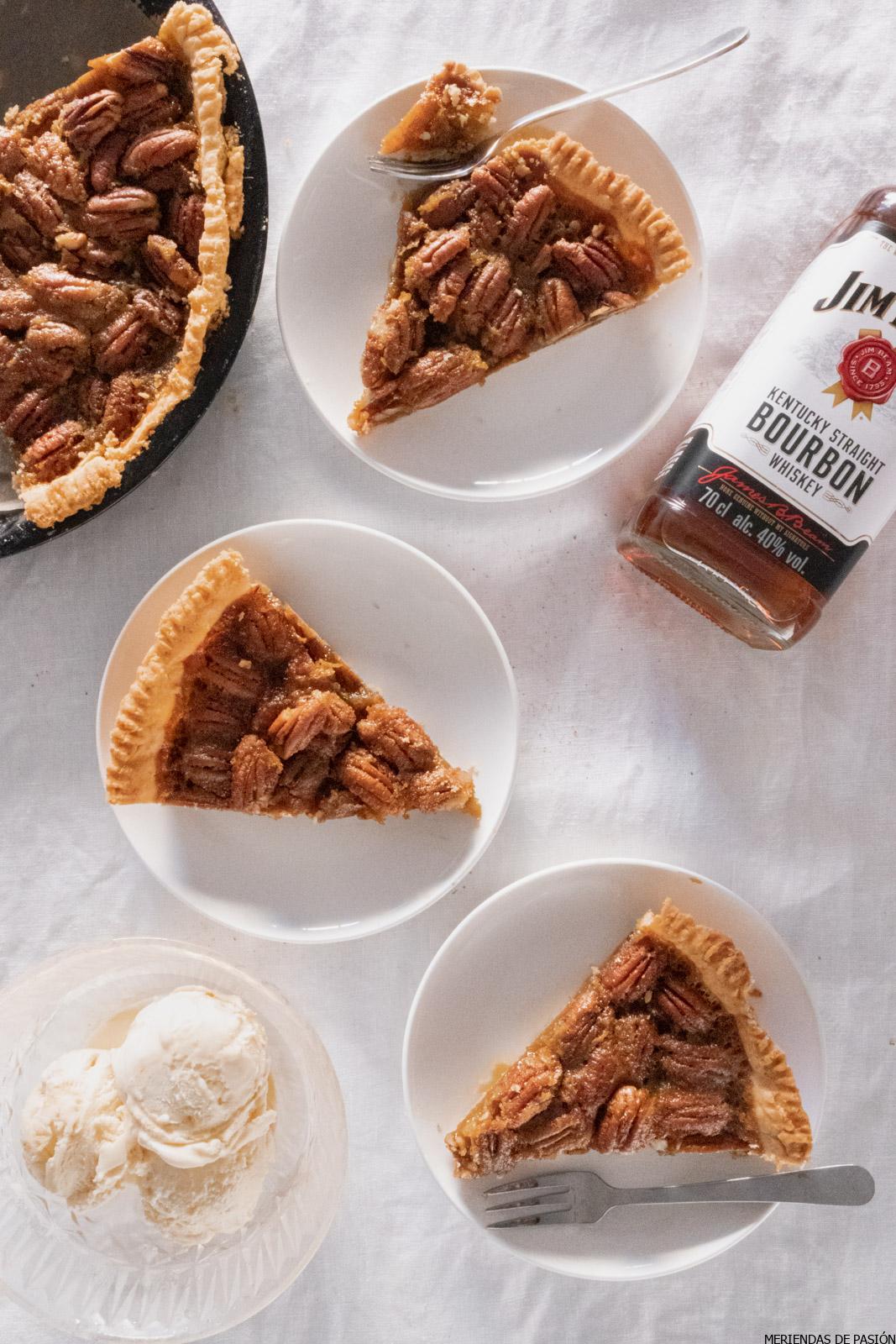 El Bourbon mezclado con el sirope de arce le da el típico sabor tostado y caramelizado a esta tarta americana de nueces pecanas, tan característico de la auténtica receta americana.Es opcional añadir Bourbon a la receta, pero si podéis conseguirlo, no os vais a arrepentir y vais a conseguir el autentico sabor del Southern Pecan Pie o pie americano del Sur de EEUU.