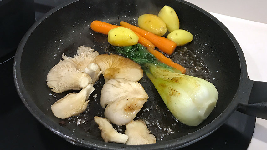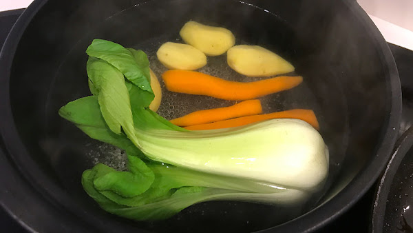 Prepara una olla con agua a hervor suave. Sazona el agua y cuece en ella el pan Choi, las patatas y las zanahorias. Cada verdura en su punto de cocción. Puedes ir probando pinchándolas con un cuchillo.