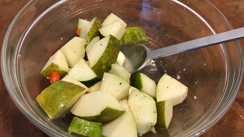Corta los extremos a la pera, córtala en cuatro partes iguales y retira el corazón. Corta en cubitos pequeños. Pon los trocitos de pera en un bol con un poco de la grasa del pato, sal y pimienta y vinagre de Jerez a tu gusto. Mezcla y reserva.