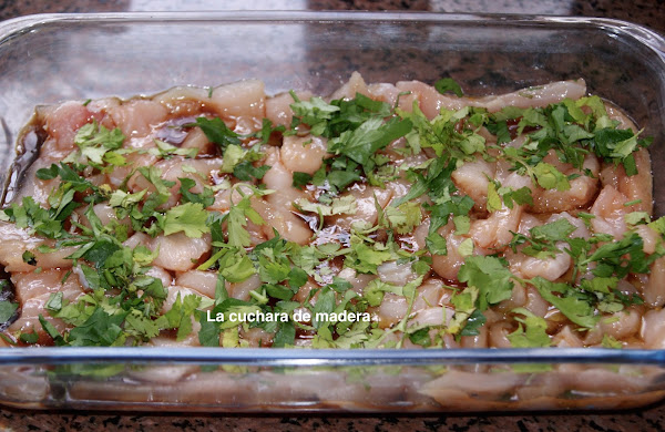 En una fuente de horno ponemos un hilo de aceite de oliva, encima los filetes de pechuga troceada, el perejil, el cilantro y la soja con los zumos que teníamos reservado.