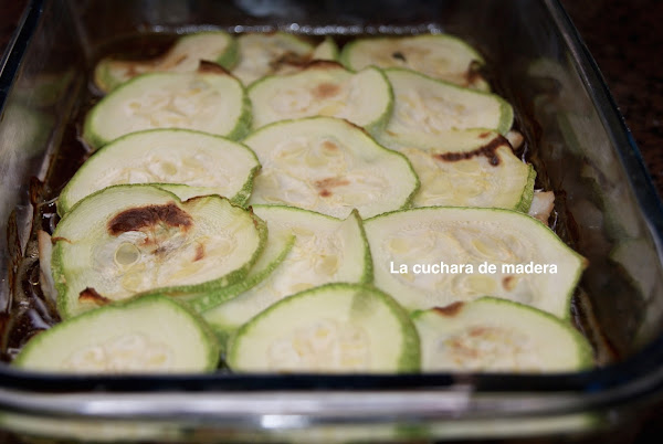 Lavamos y cortamos los calabacinos en rodajas muy finas, lo colocamos encima.
