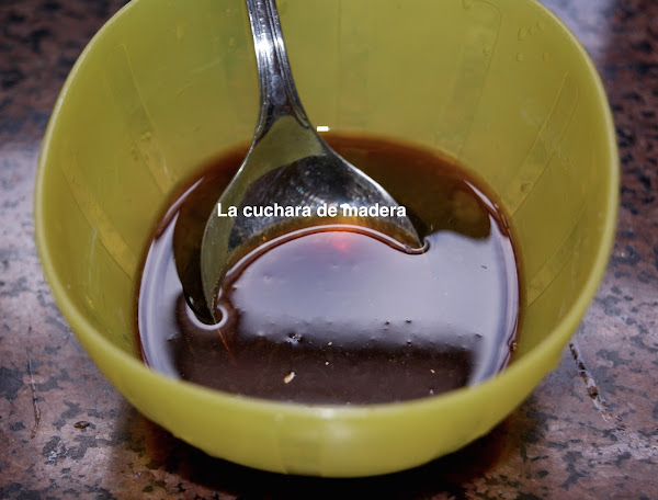 En un bol pequeño ponemos 4 cucharas grandes de zumo de naranja, 3 de zumo de limón y dos de soja.