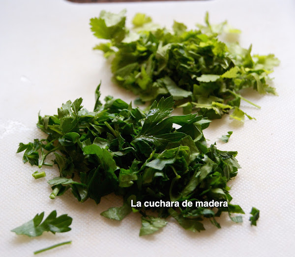 Picamos unas hojas de perejil y cilantro previamente lavadas.