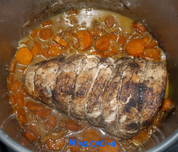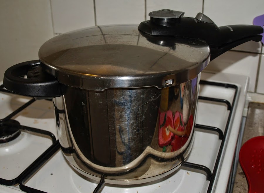 - Una vez cerrada la olla, cuando la válvula empiece a dar vueltas, si es el modelo tradicional, o salga para fuera el botoncito, en el caso de la olla rápida, bajamos a fuego medio y dejamos cocer. Para una pechuga de 1 kilo yo lo suelo dejar unos 35 - 40 minutos en la olla exprés tradicional y unos 20 en la olla rápida. Aquí en Dinamarca tengo la rápida y la verdad es que estoy encantada.