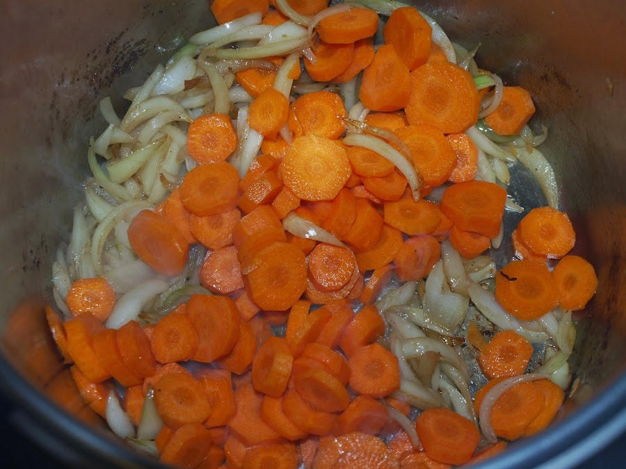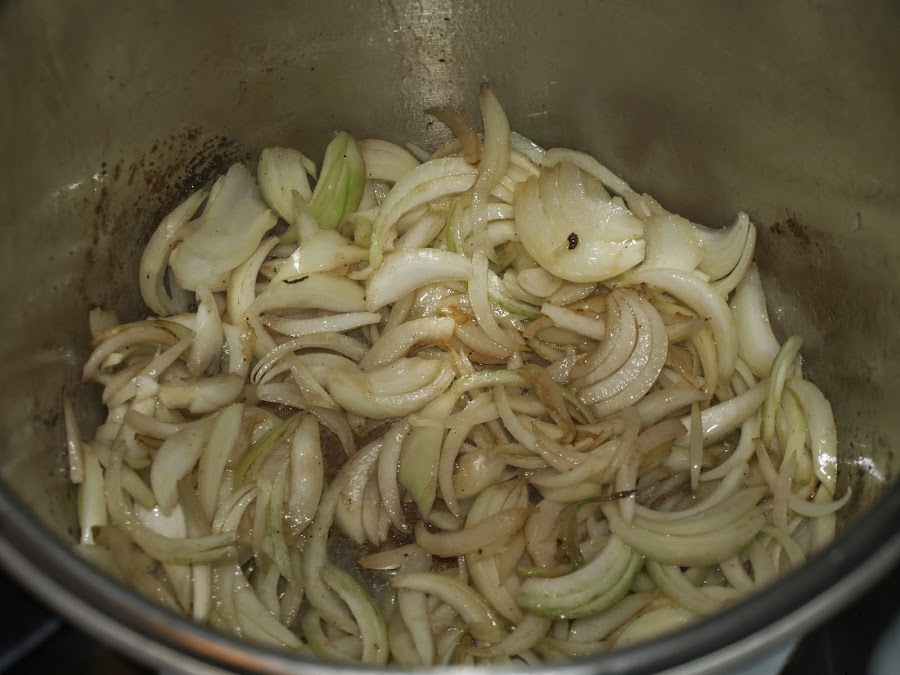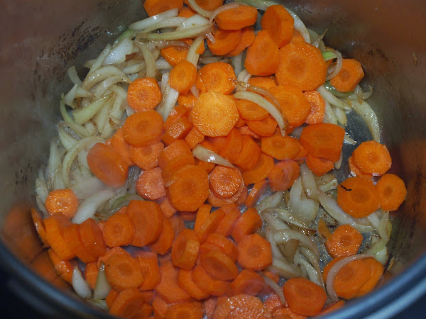 - En la misma olla, ponemos ahora las cebollas. Si hace falta, añadimos más aceite. Las doramos unos minutos.