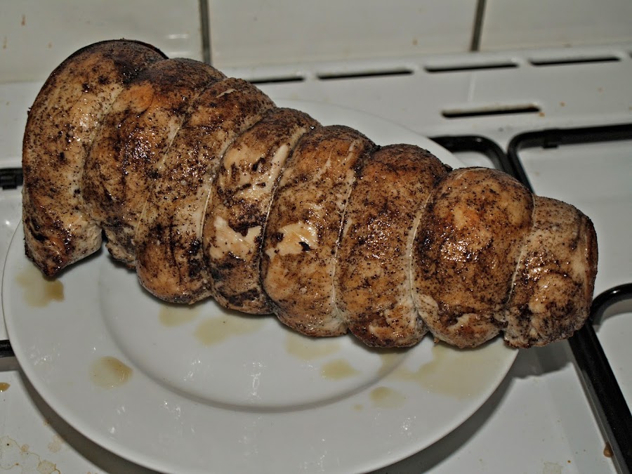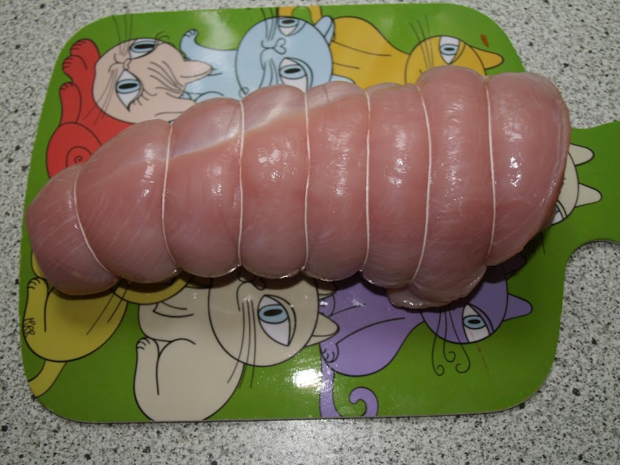 - Cuando mi madre compra la pechuga en en pollero se la preparan dentro de una red, para contenerla y que luego salgan los filetes redonditos. Como aquí en Dinamarca la tengo que comprar en el super, me tengo que apañar como puedo y lo hago yo misma, más o menos, con hilo especial para cocinar. No es que haga una red pero voy atando trozos de cuerda a lo largo de toda la pechuga y consigo así dar la forma deseada para que no se rompa al cocinar y luego al filetear quede bien.
