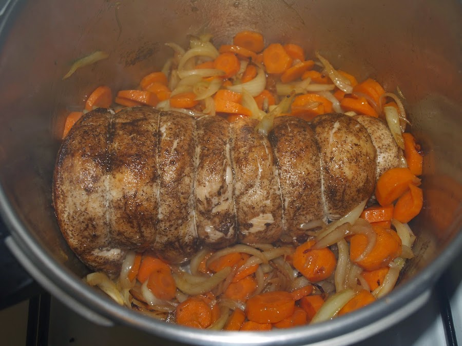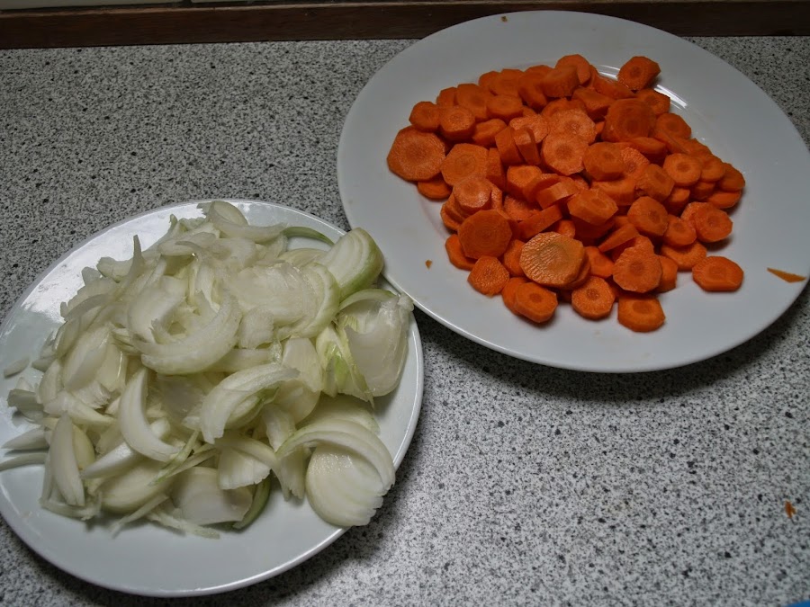 - Una vez tenemos la pechuga lista en la red o recogida con las cuerdas, cortamos la cebolla en tiras y la zanahoria en rodajas y las reservamos.