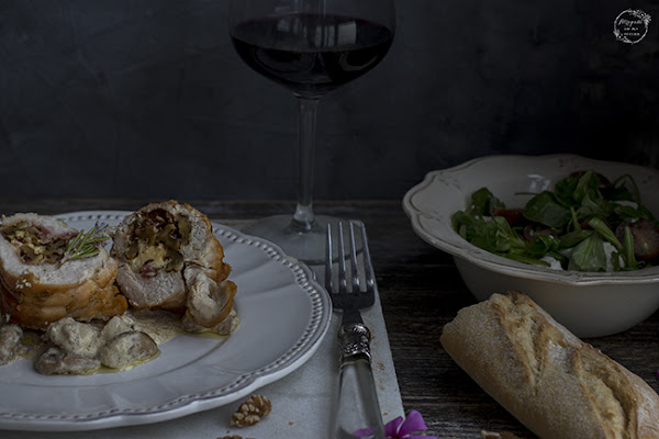 Lo primero que haremos será abrir la pechuga en forma de libro dejándola fina por todos lados, para ello abrís por la mitad sin llegar a cortarla del todo y seguís abriendo cada mitad sin llegar nunca a cortar del todo, luego podemos pasarle un rodillo para que quede más uniforme (podéis pedirle al carnicero que lo haga por vosotros si os resulta más complicado). Salpimentamos. Encima ponemos las lonchas de bacon necesarias para cubrir todo el interior de la pechuga (las otras las dejamos para añadirlas a la salsa). Añadimos el queso cortado en dados y las nueces (las nueces las salteamos previamente durante unos minutos para no ponerlas crudas). Una vez añadido todo el relleno vamos cerrando la pechuga como si de un brazo gitano se tratase, apretando bastante para que no se salga nada. Después amarramos con hilo de cocina de modo que quede bien enrollada la carne y el relleno no se salga por ningún lado.