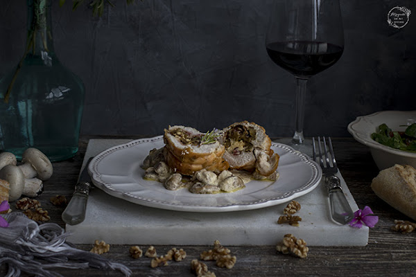 Introducimos en el horno a 200 º con un buen chorreón de AOVE por encima durante una hora o un poco más (dependerá del tamaño del rollo de pavo) hasta que veamos que está dorado. Una vez terminado usaremos el líquido que ha soltado de la cocción y ponemos en una sartén, con él salteamos los champiñones cortados en tres o cuatro trozos. Añadimos también unas nueces y el bacon troceado que nos había sobrado de rellenar el pavo. Rehogamos todos unos minutos, añadimos la nata (crema de leche), y cuando se caliente le añadimos el vino blanco. Salpimentamos y dejamos reducir hasta que la salsa espese. Servimos el pavo relleno cortado en rodajas junto con la salsa.