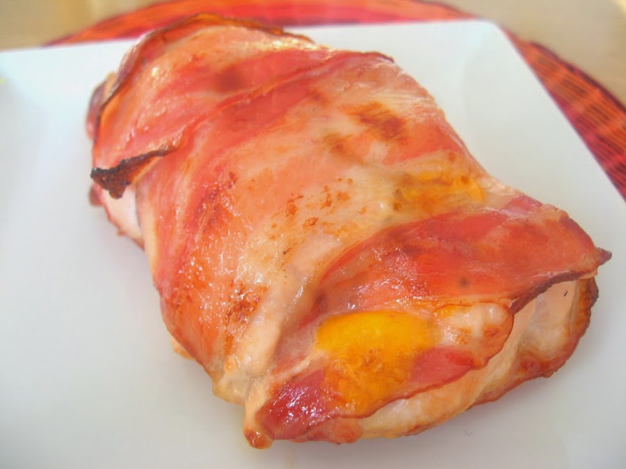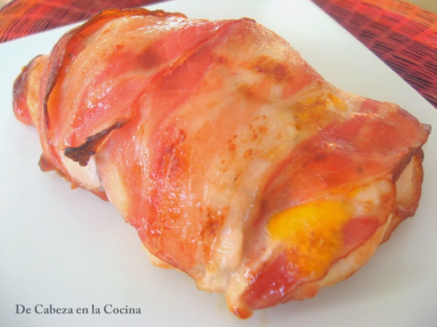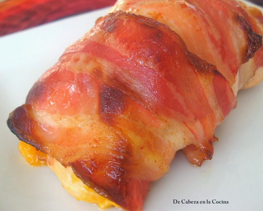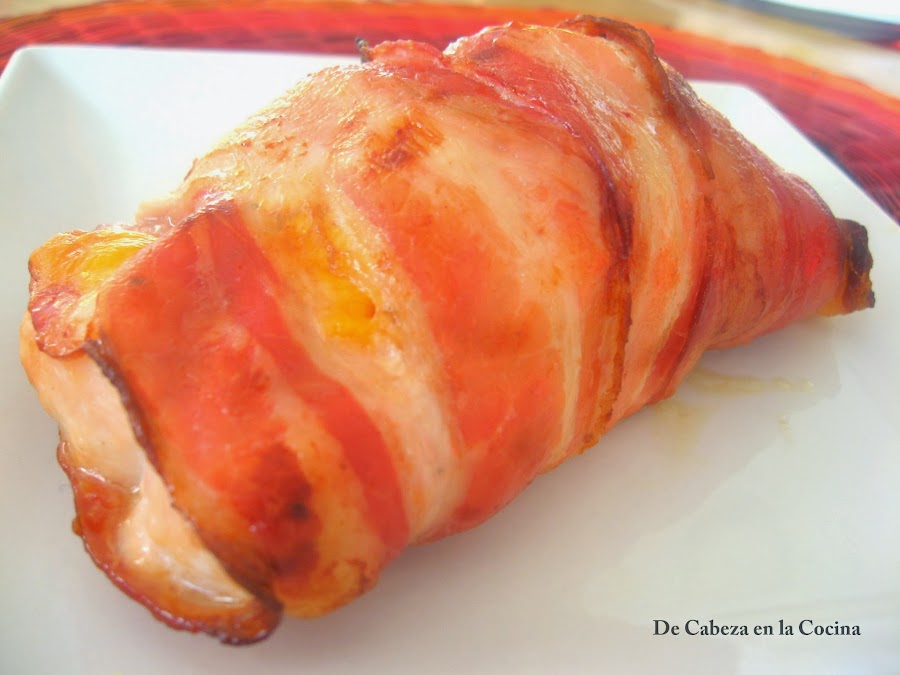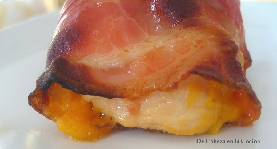 Llevar al horno por 25 minutos a 180 grados. La grasa del queso y la "cobertura" de bacon mantienen la carne de pechuga jugosa y deliciosa.