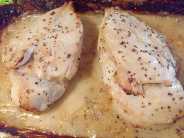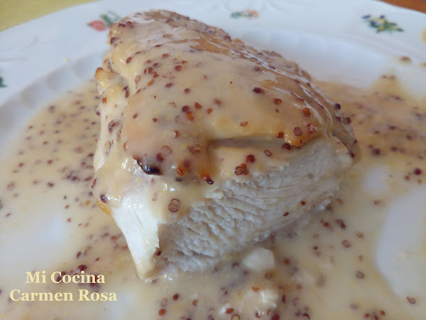 2 trozos de pechugas de pollo (limpias de piel y hueso) enteras, 4 cucharadas soperas bien colmadas de mayonesa, 3 cucharadas soperas de mostaza a la antigua, 2 cucharadas soperas de miel, 3 cucharadas soperas de vino blanco y sal.