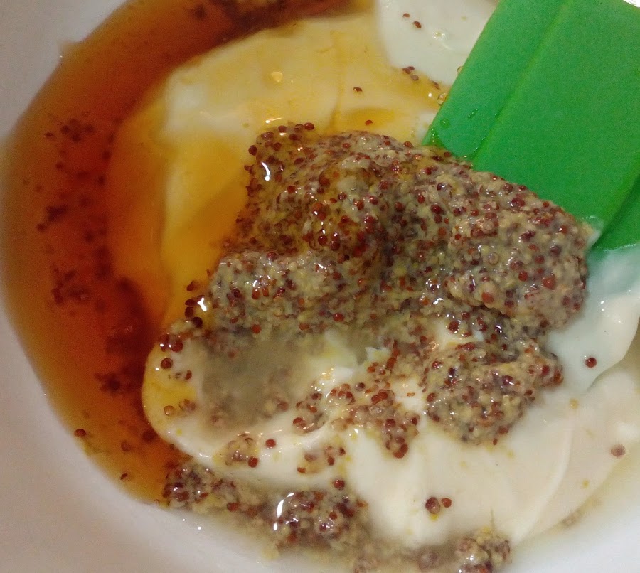 En un cuenco echar la mayonesa, la mostaza a la antigua, la miel, el vino y una pizca de sal.