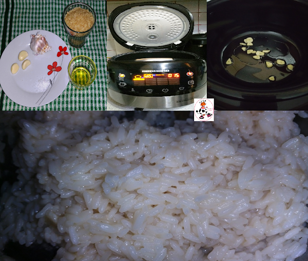 Añadimos el aceite y los dientes de ajo picaditos en el cuenco de la olla rápida multicocción. Añadimos el arroz, el agua y la sal. Mezclamos y cerramos la tapa. Ponemos el programa GRAIN, tiempo de preparación 15 minutos. Cocinar hasta el final del programa. Reservamos.